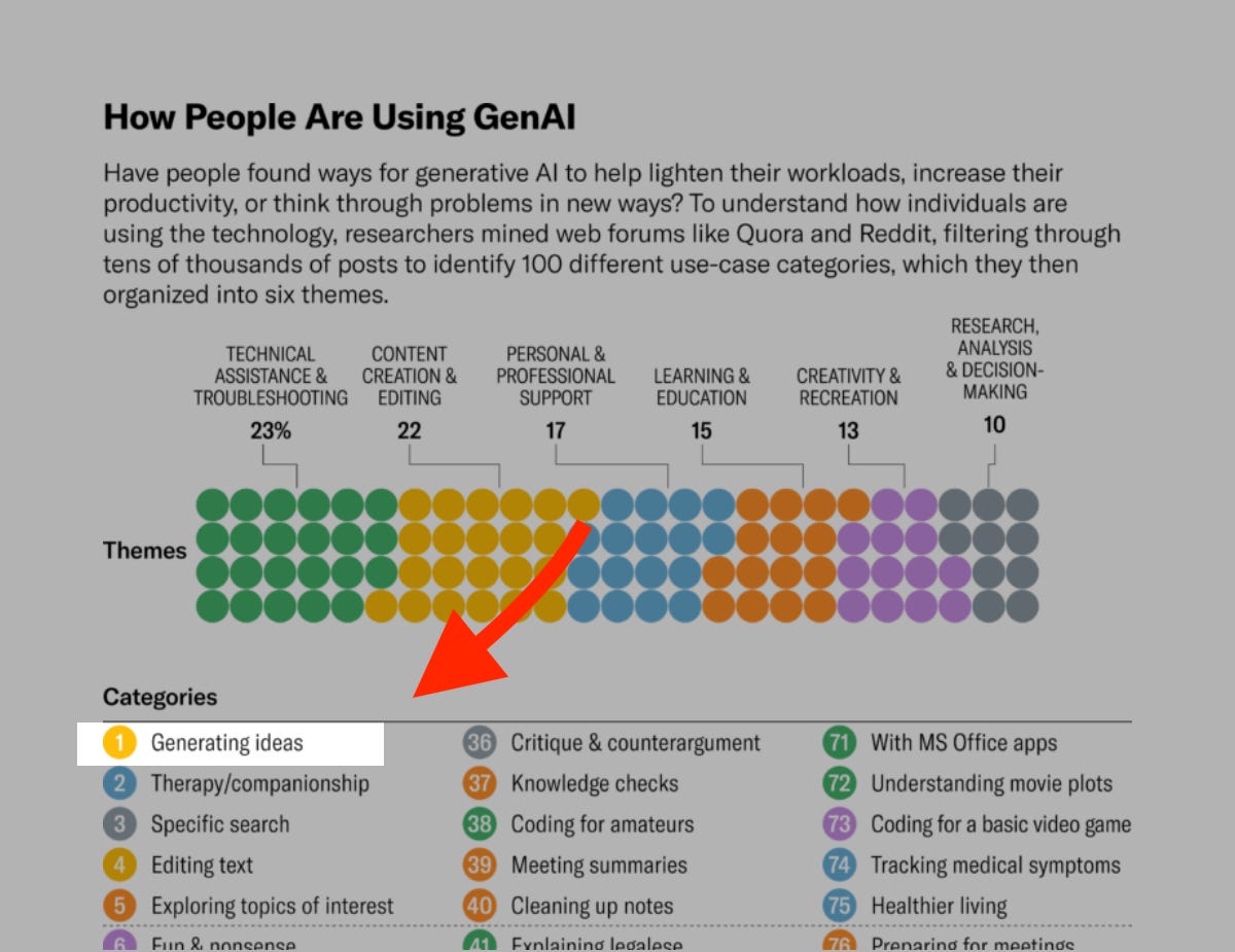According to research published in the Harvard Business Review, the most common way people use ChatGPT is to generate ideas. This finding came from an analysis of tens of thousands of posts on forums like Reddit and Quora.