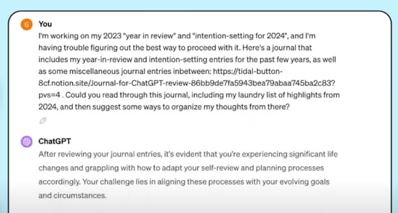 First, Gena asked ChatGPT to read through her journal entries, saying that she was working on her 2023 year in review and gave it 5 years worth of journal entries.